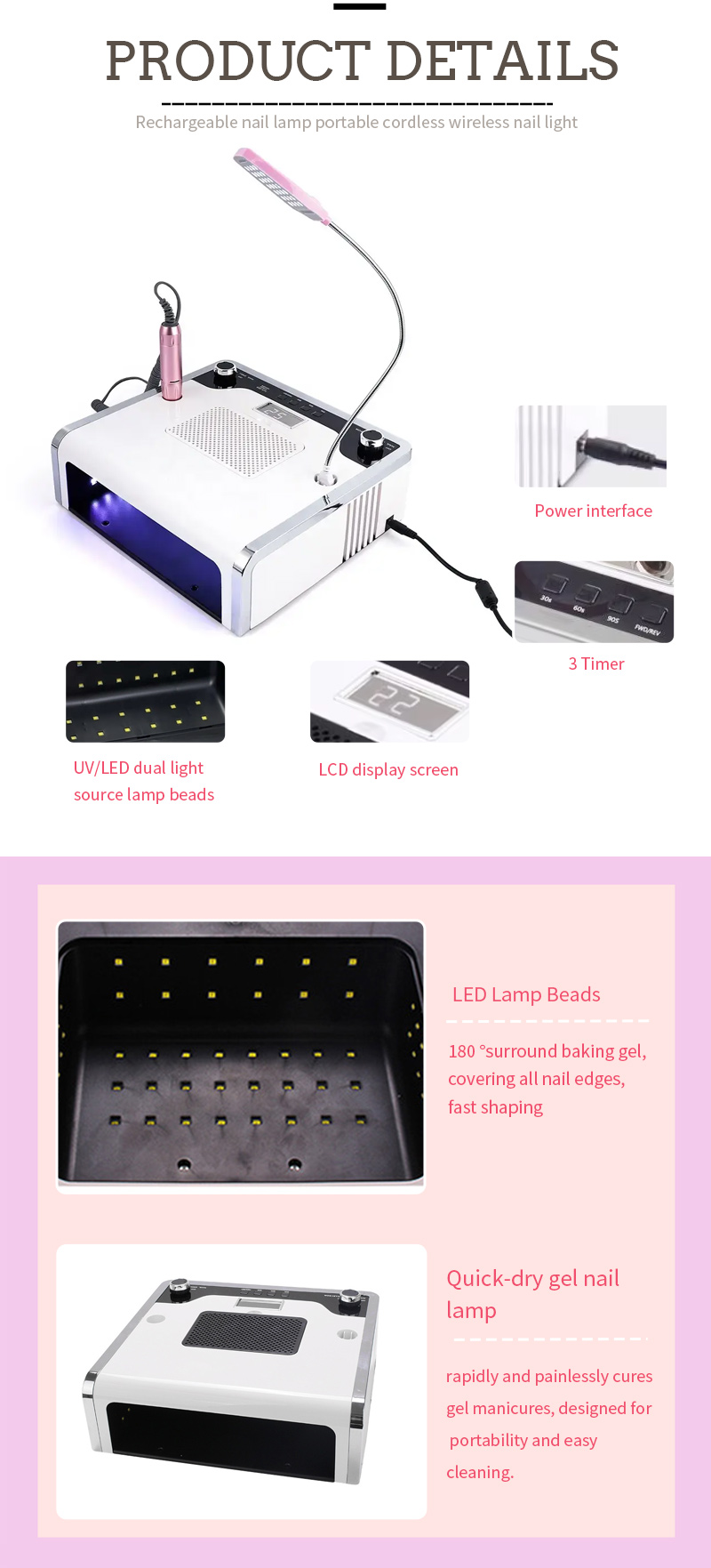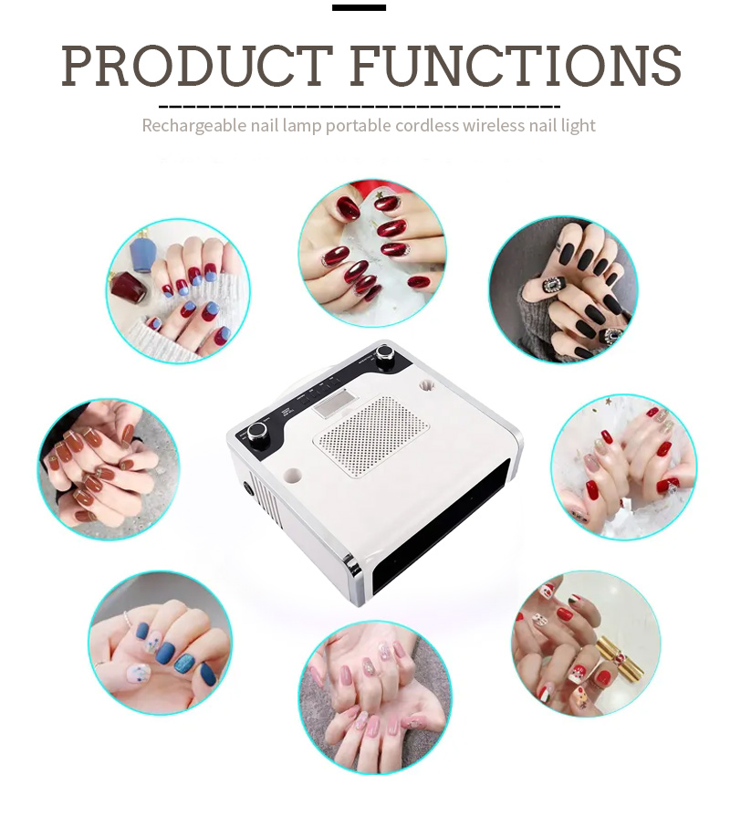 4-ը-1-ում բազմաֆունկցիոնալ եղունգների լամպը ապահովում է սոսինձի հավասարաչափ չորացում՝ առանց կծկվելու: Նրա կրկնակի լույսի աղբյուրները ապահովում են նուրբ տաքացում՝ կանխելու ձեռքերի գունաթափումը և աչքերի լարվածությունը, որը հարմար է ինչպես ձեռքերի, այնպես էլ ոտքերի համար՝ ապահովելով զգալի արագ չորացման արդյունքներ:
