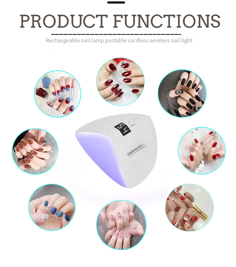 Ապրանքն ապահովում է նույնիսկ սոսինձի չորացում առանց նեղացման: Նրա երկակի լույսի աղբյուրները տալիս են մեղմ ջեռուցում `ձեռքը գունաթափման եւ աչքի լարը կանխելու համար, որոնք հարմար են ինչպես ձեռքի, այնպես էլ ոտքերի համար, զգալիորեն արագ չորացման արդյունքներ տալով: