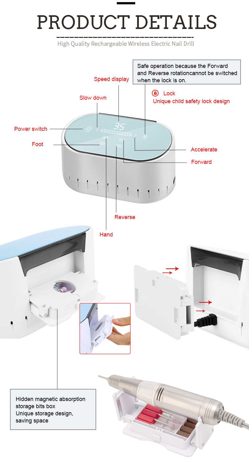 Վերալիցքավորվող անլար եղունգների հորատիչ մեքենա Հզոր 45w 40000rpm