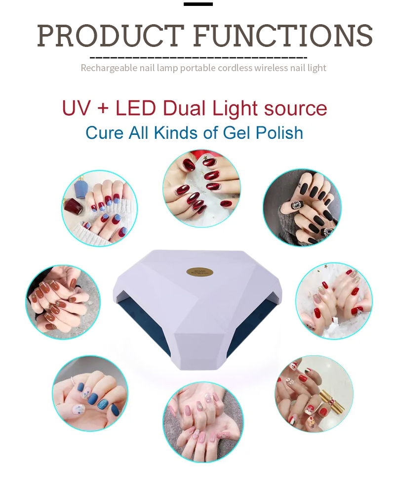 Ապրանքն ապահովում է նույնիսկ սոսինձի չորացում առանց նեղացման: Նրա երկակի լույսի աղբյուրները տալիս են մեղմ ջեռուցում `ձեռքը գունաթափման եւ աչքի լարը կանխելու համար, որոնք հարմար են ինչպես ձեռքի, այնպես էլ ոտքերի համար, զգալիորեն արագ չորացման արդյունքներ տալով: