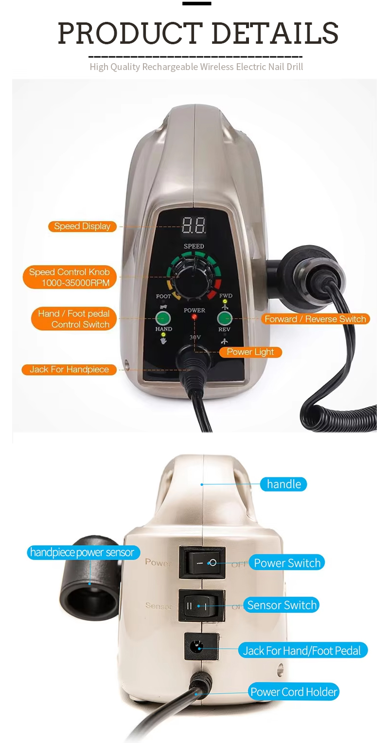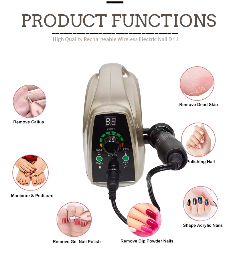 DM-014A գերարագ 35,000 RPM էլեկտրական եղունգների ֆայլի արտադրանքի առանձնահատկությունները եւ ծրագրերը եղունգների լեհական հեռացման համար