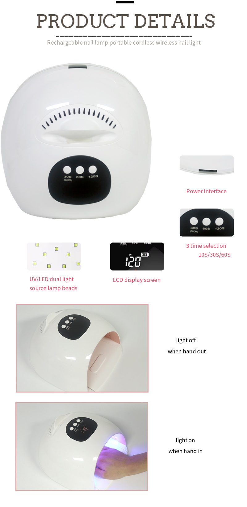 Ապրանքը ապահովում է սոսինձի հավասարաչափ չորացում՝ առանց կծկվելու: Նրա կրկնակի լույսի աղբյուրները ապահովում են նուրբ տաքացում՝ կանխելու ձեռքերի գունաթափումը և աչքերի լարվածությունը, որը հարմար է ինչպես ձեռքերի, այնպես էլ ոտքերի համար՝ ապահովելով զգալի արագ չորացման արդյունքներ: