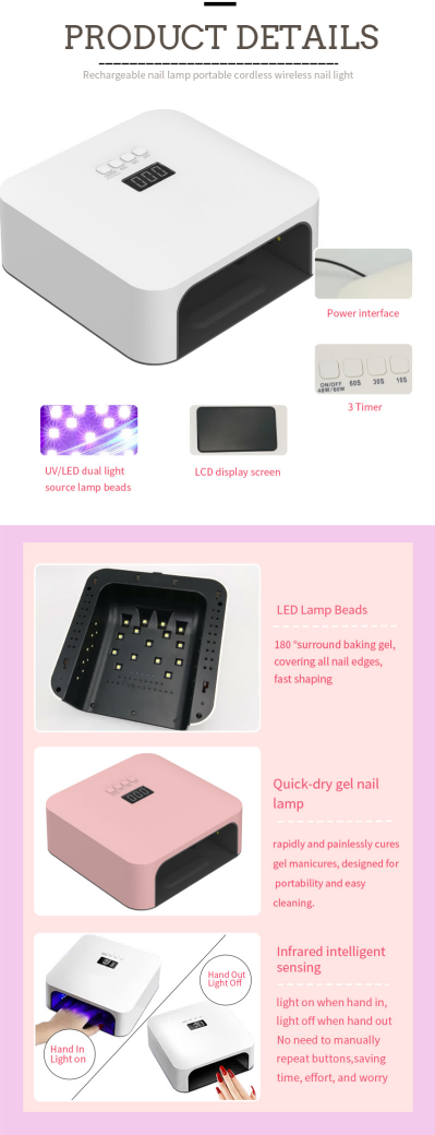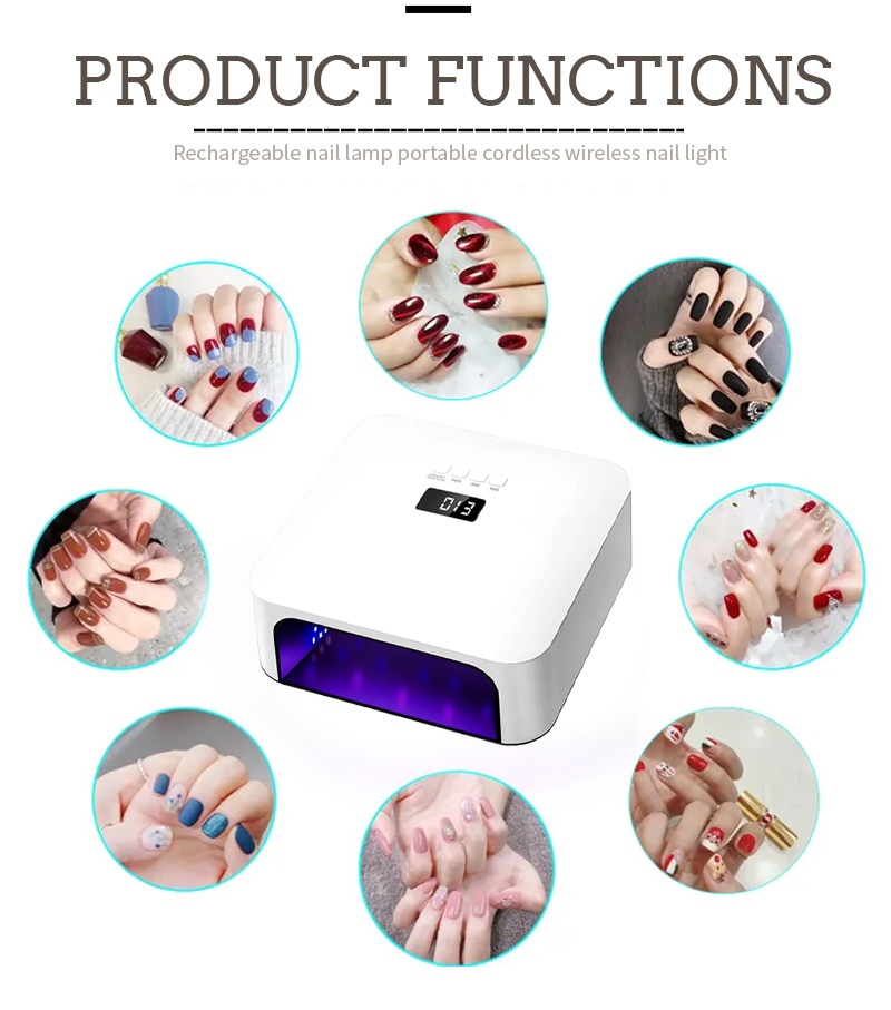 Եղունգների արագ չորացման բարձրորակ լամպը ապահովում է սոսինձի հավասարաչափ չորացում՝ առանց կծկվելու: Նրա կրկնակի լույսի աղբյուրները ապահովում են նուրբ տաքացում՝ կանխելու ձեռքերի գունաթափումը և աչքերի լարվածությունը, որը հարմար է ինչպես ձեռքերի, այնպես էլ ոտքերի համար՝ ապահովելով զգալի արագ չորացման արդյունքներ:
