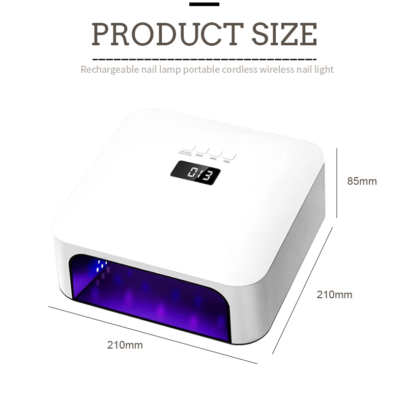 Եղունգների արագ չորացման այս բարձրորակ լամպի չափերն են՝ 210 մմ երկարությամբ, 210 մմ լայնությամբ և 85 մմ բարձրությամբ, մեծ տարողությամբ և թե՛ ձեռքերը, թե՛ ոտքերը օգտագործելու ունակությամբ, ինչը շատ հարմար է։