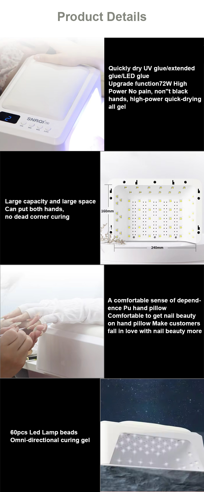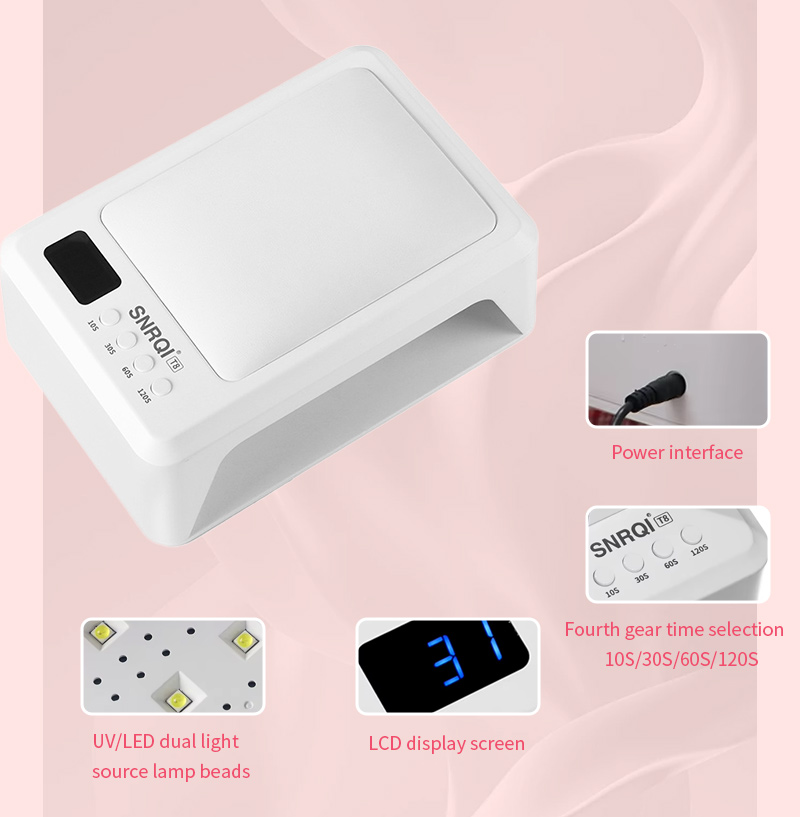 Ապրանքը ապահովում է սոսինձի հավասարաչափ չորացում՝ առանց կծկվելու: Նրա կրկնակի լույսի աղբյուրները ապահովում են նուրբ տաքացում՝ կանխելու ձեռքերի գունաթափումը և աչքերի լարվածությունը, որը հարմար է ինչպես ձեռքերի, այնպես էլ ոտքերի համար՝ ապահովելով զգալի արագ չորացման արդյունքներ: