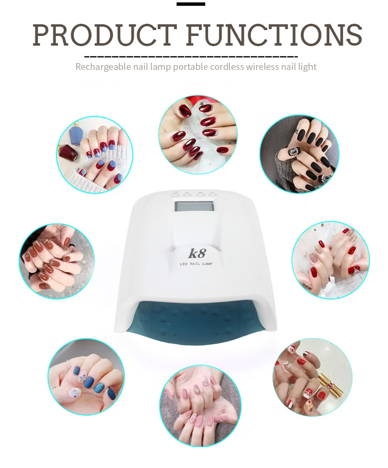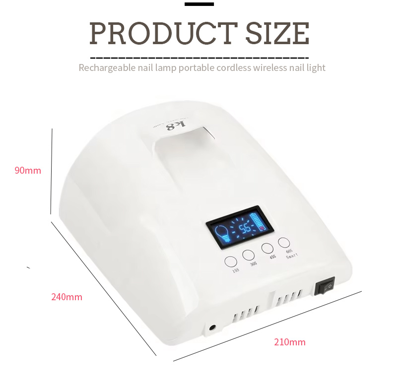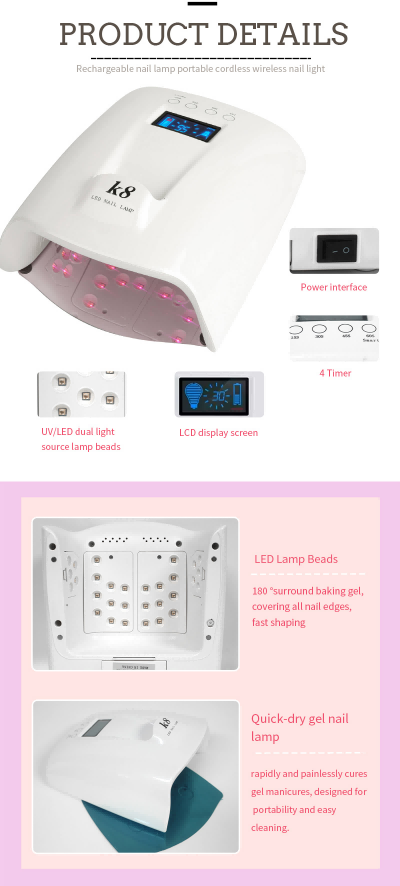 Բռնակով եղունգների չորացման մեծ հզորությամբ լամպը ապահովում է սոսինձի հավասարաչափ չորացում՝ առանց կծկվելու: Նրա կրկնակի լույսի աղբյուրները ապահովում են նուրբ տաքացում՝ կանխելու ձեռքերի գունաթափումը և աչքերի լարվածությունը, որը հարմար է ինչպես ձեռքերի, այնպես էլ ոտքերի համար՝ ապահովելով զգալի արագ չորացման արդյունքներ: