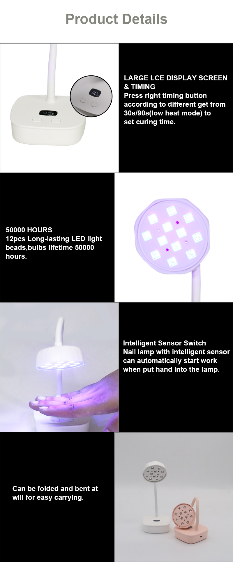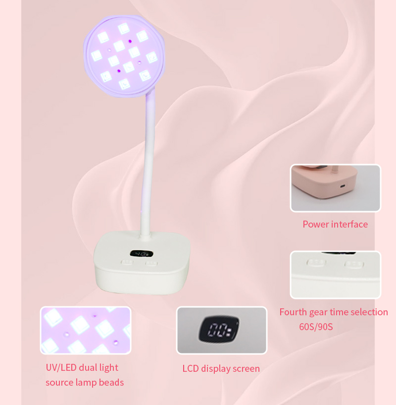 Ապրանքը ապահովում է սոսինձի հավասարաչափ չորացում՝ առանց կծկվելու: Նրա կրկնակի լույսի աղբյուրները ապահովում են նուրբ տաքացում՝ կանխելու ձեռքերի գունաթափումը և աչքերի լարվածությունը, որը հարմար է ինչպես ձեռքերի, այնպես էլ ոտքերի համար՝ ապահովելով զգալի արագ չորացման արդյունքներ: