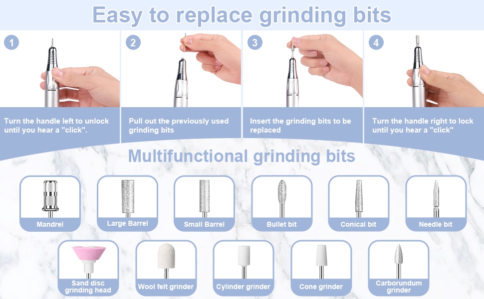 Այս ցածր աղմուկի շարժական եղունգների գայլիկոնի հանդերձանքի փոխարինման փորվածքի շահագործման մեթոդը, այն է՝ միացնել և հանել, հեշտ և հարմար, փոխարինումը կարող է օգտագործվել ավարտից հետո: