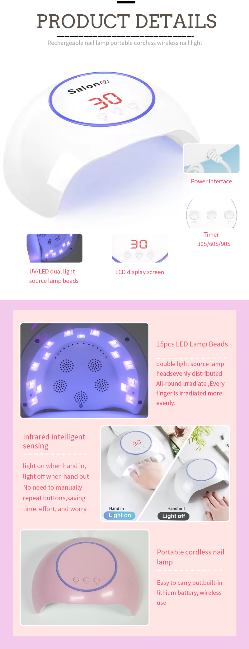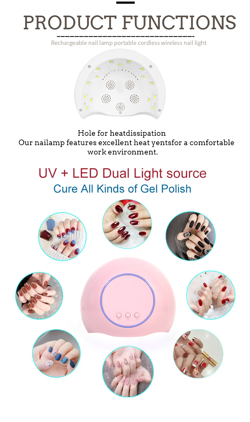 Ապրանքն ապահովում է նույնիսկ սոսինձի չորացում առանց նեղացման: Նրա երկակի լույսի աղբյուրները տալիս են մեղմ ջեռուցում `ձեռքը գունաթափման եւ աչքի լարը կանխելու համար, որոնք հարմար են ինչպես ձեռքի, այնպես էլ ոտքերի համար, զգալիորեն արագ չորացման արդյունքներ տալով: