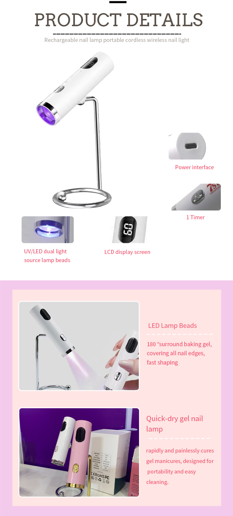 Ապրանքն ապահովում է նույնիսկ սոսինձի չորացում առանց նեղացման: Նրա երկակի լույսի աղբյուրները տալիս են մեղմ ջեռուցում `ձեռքը գունաթափման եւ աչքի լարը կանխելու համար, որոնք հարմար են ինչպես ձեռքի, այնպես էլ ոտքերի համար, զգալիորեն արագ չորացման արդյունքներ տալով:
