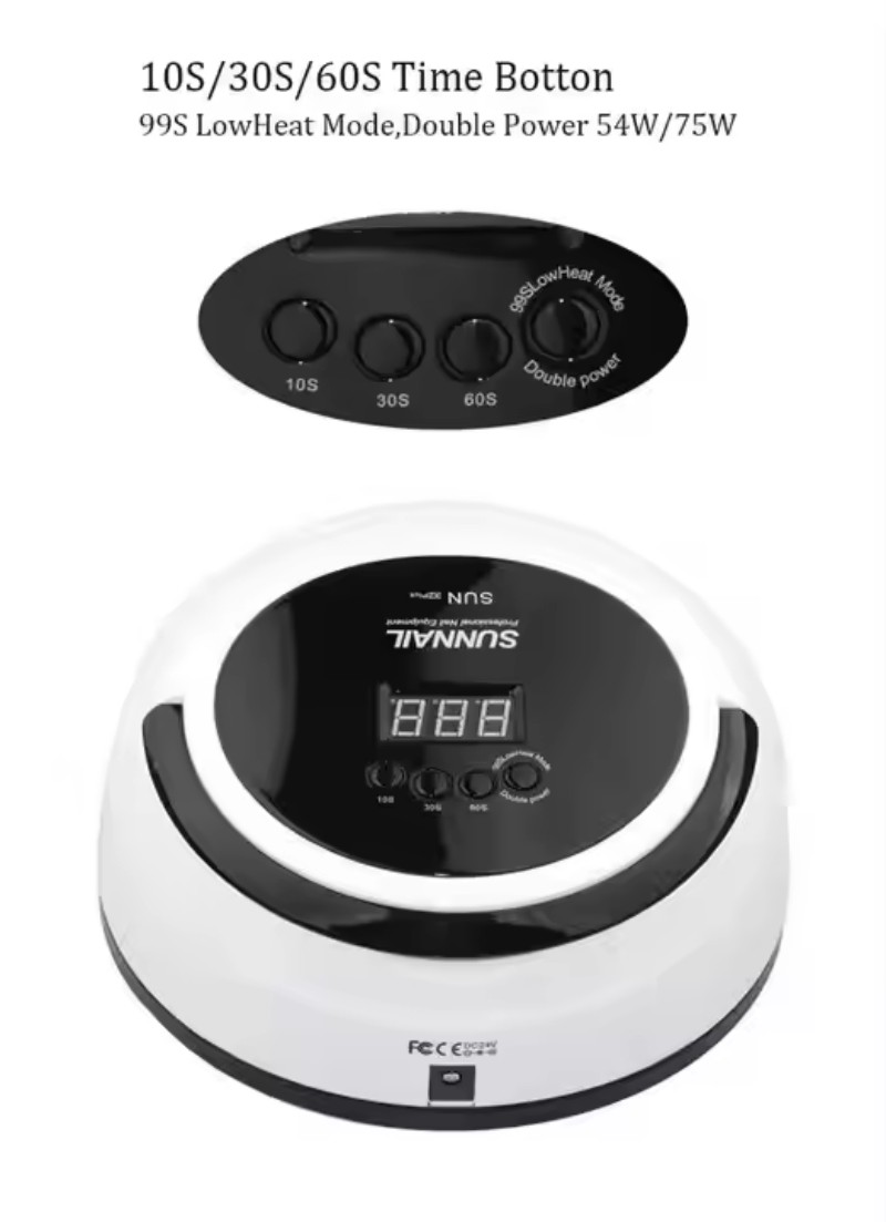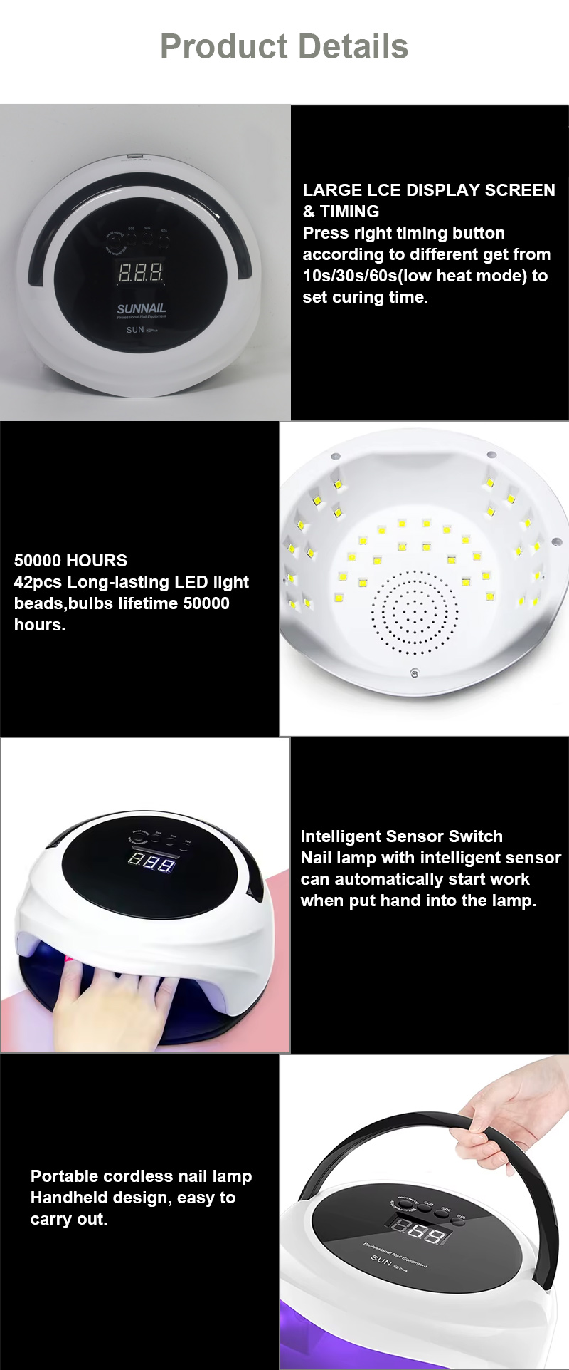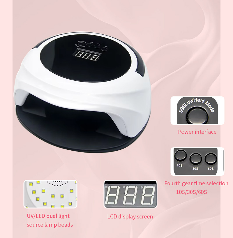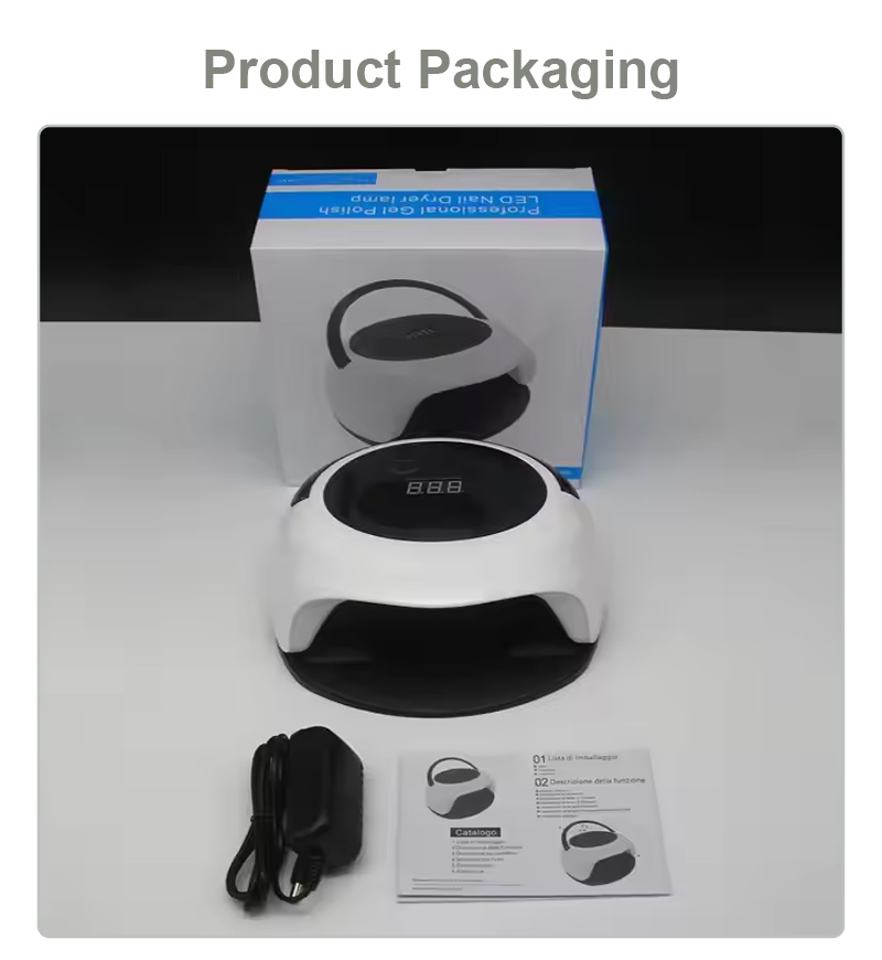 Եղունգների չորացման լամպը ավտոմատ սենսորային ֆունկցիայով ապահովում է սոսինձի հավասարաչափ չորացում՝ առանց կծկվելու: Նրա կրկնակի լույսի աղբյուրները ապահովում են նուրբ տաքացում՝ կանխելու ձեռքերի գունաթափումը և աչքերի լարվածությունը, որը հարմար է ինչպես ձեռքերի, այնպես էլ ոտքերի համար՝ ապահովելով զգալի արագ չորացման արդյունքներ:
