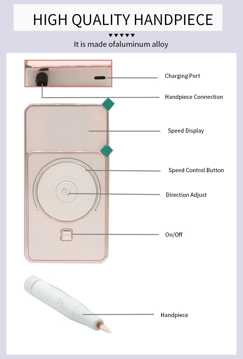 Այս բարձր արագությամբ ցածր աղմուկի հղկող գրիչի էկրանի դիզայնը, հղկող գրիչի վարդակից, LCD հեղուկ բյուրեղյա էկրանով, կարող է ցույց տալ պտույտների/հզորության/ուղղության քանակը, արագության անջատիչի կոճակը, ժամացույցի սլաքի ուղղությամբ/ժամացույցի սլաքի ուղղությամբ փոխարկիչի կոճակը, դադարի կոճակը, 30,000 պտ/րոպե պրոֆեսիոնալ շարժիչը, պտուտակով փակող հղկման գլուխը:
