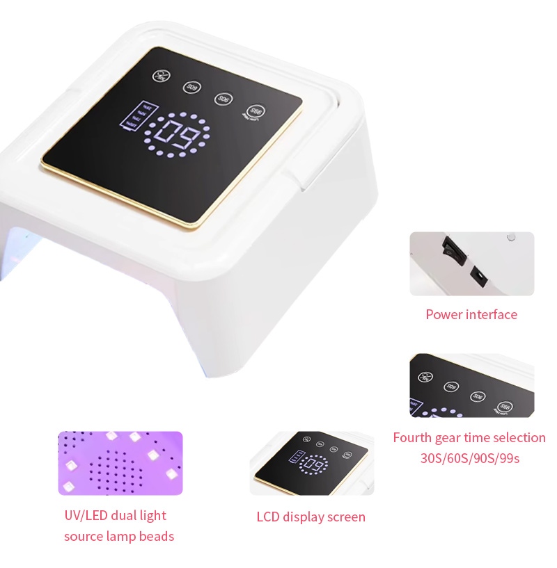Եղունգների չորացման քառակուսի լամպը ապահովում է սոսինձի հավասարաչափ չորացում՝ առանց կծկվելու: Նրա կրկնակի լույսի աղբյուրները ապահովում են նուրբ տաքացում՝ կանխելու ձեռքերի գունաթափումը և աչքերի լարվածությունը, որը հարմար է ինչպես ձեռքերի, այնպես էլ ոտքերի համար՝ ապահովելով զգալի արագ չորացման արդյունքներ: