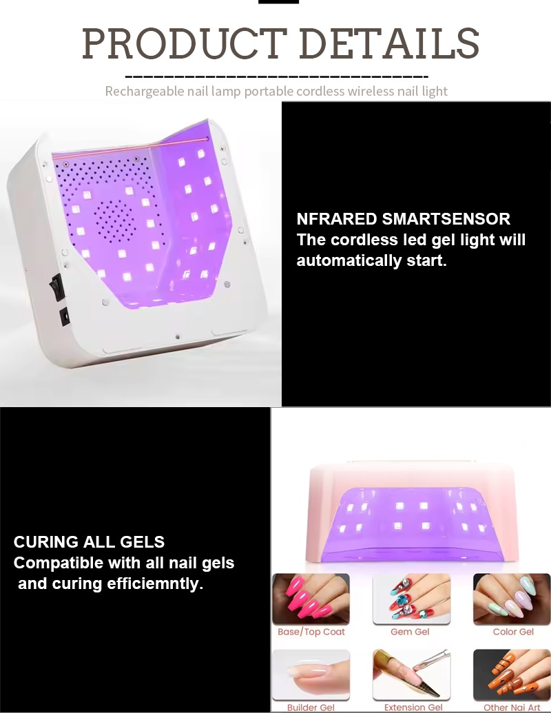 Եղունգների չորացման քառակուսի լամպն ունի ինֆրակարմիր խելացի զգայության տեխնոլոգիա, որն ավտոմատ կերպով լուսավորվում է, երբ ձեռքերը մոտենում են և անջատվում, երբ ձեռքերը հեռանում են՝ վերացնելով կոճակները բազմիցս սեղմելու դժվարությունը և խնայելով ժամանակ և ջանք: Բարձր հզորությամբ թխելու սոսինձը երկար սպասել չի պահանջում՝ խնայելով և՛ ժամանակ, և՛ ջանք: