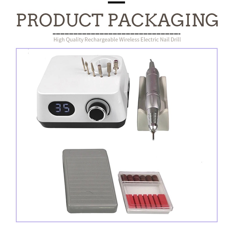 35000 պտույտ/րոպե փաթեթով այս անլար էլեկտրական եղունգների գայլիկոնի պարունակությունն ունի հղկող գրիչ, USB լիցքավորման մալուխ, արտադրանքի հրահանգների ձեռնարկ և թեթև և շարժական տուփ: